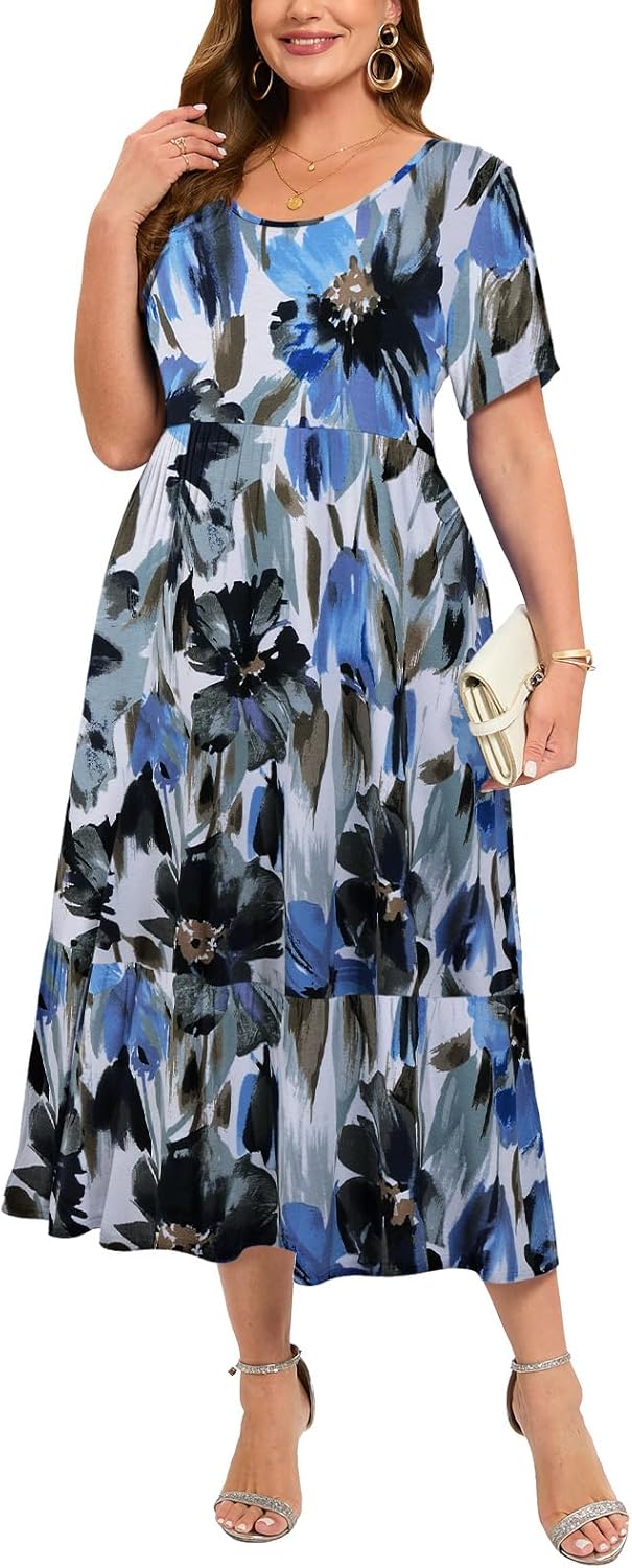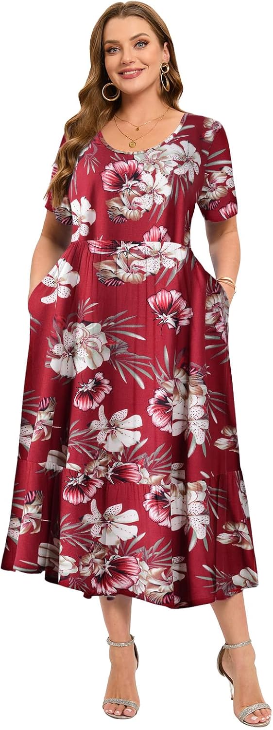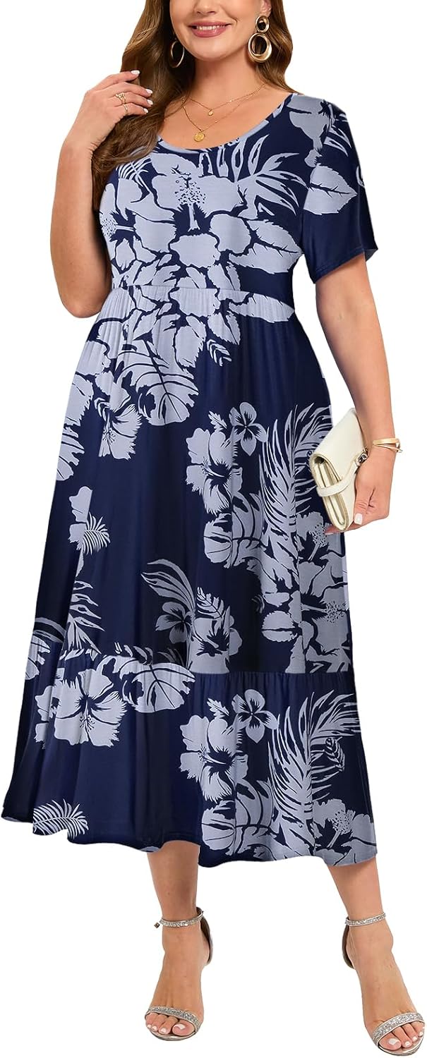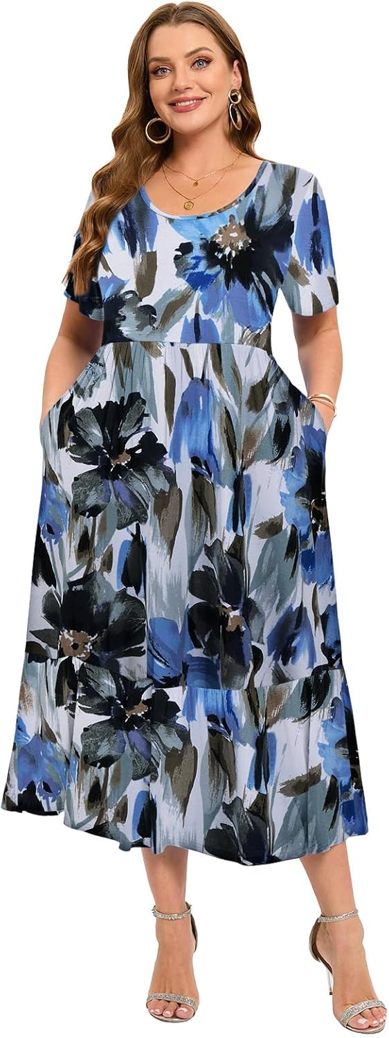LARACE Plus Size Dresses for Women Summer Casual Short Sleeve Long Dress Flowy Maxi Beach Dresses with Pockets L-6XL